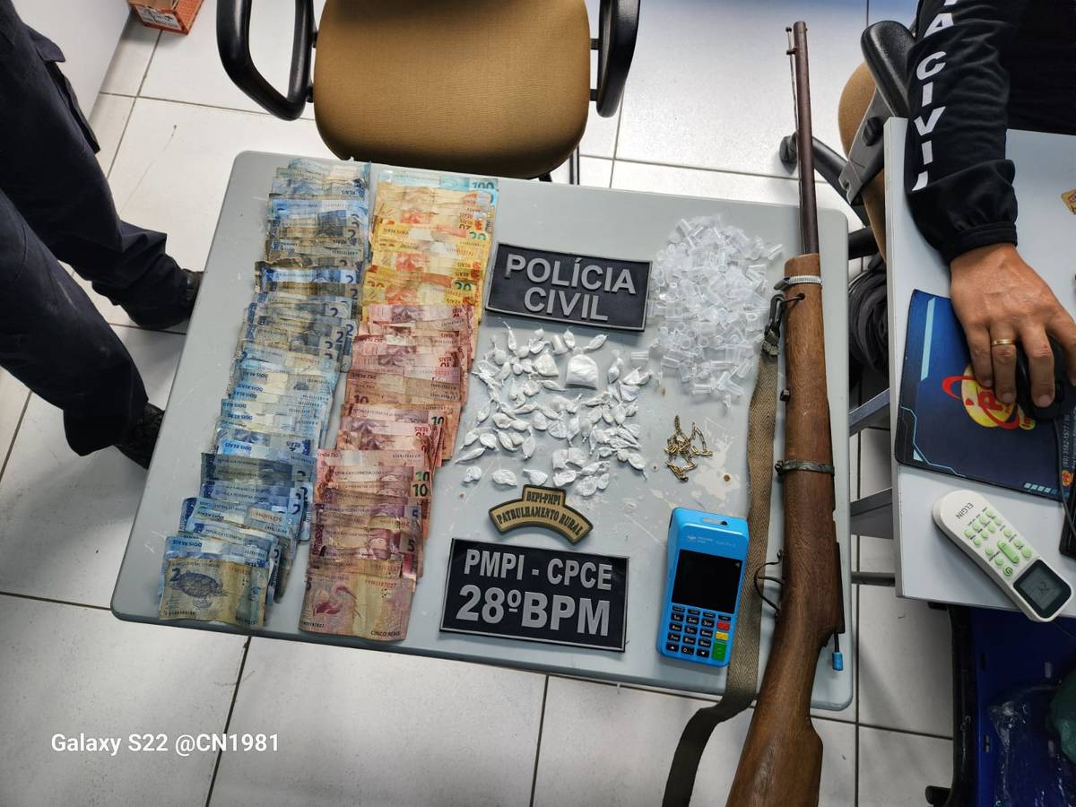 Foram apreendidos embalagens com cocaína, uma espingarda, uma máquina de cartão, dinheiro e frascos para o armazenamento de substancias psicoativas.