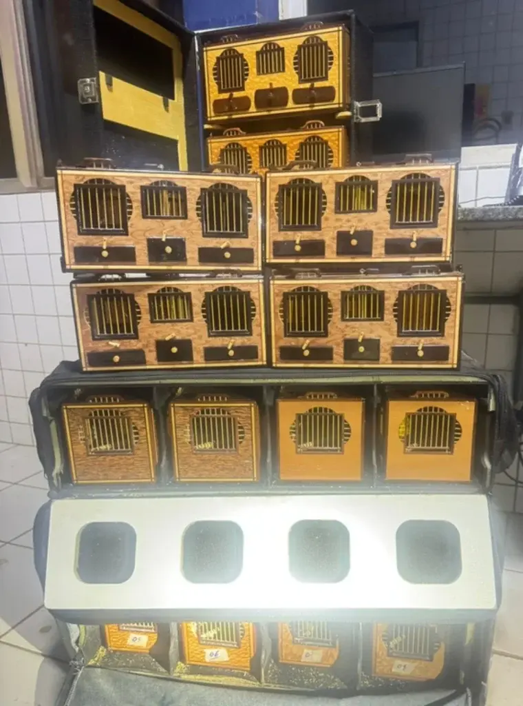 Durante a inspeção no interior do automóvel, os policiais visualizaram diversas gaiolas de pequeno porte acondicionadas sobre o banco traseiro. Ao verificarem o conteúdo, constataram a presença de aves transportadas em casais. Questionados, os ocupantes informaram tratar-se de “canários-belgas”, espécie exótica cuja criação e transporte não exigiriam autorização específica.