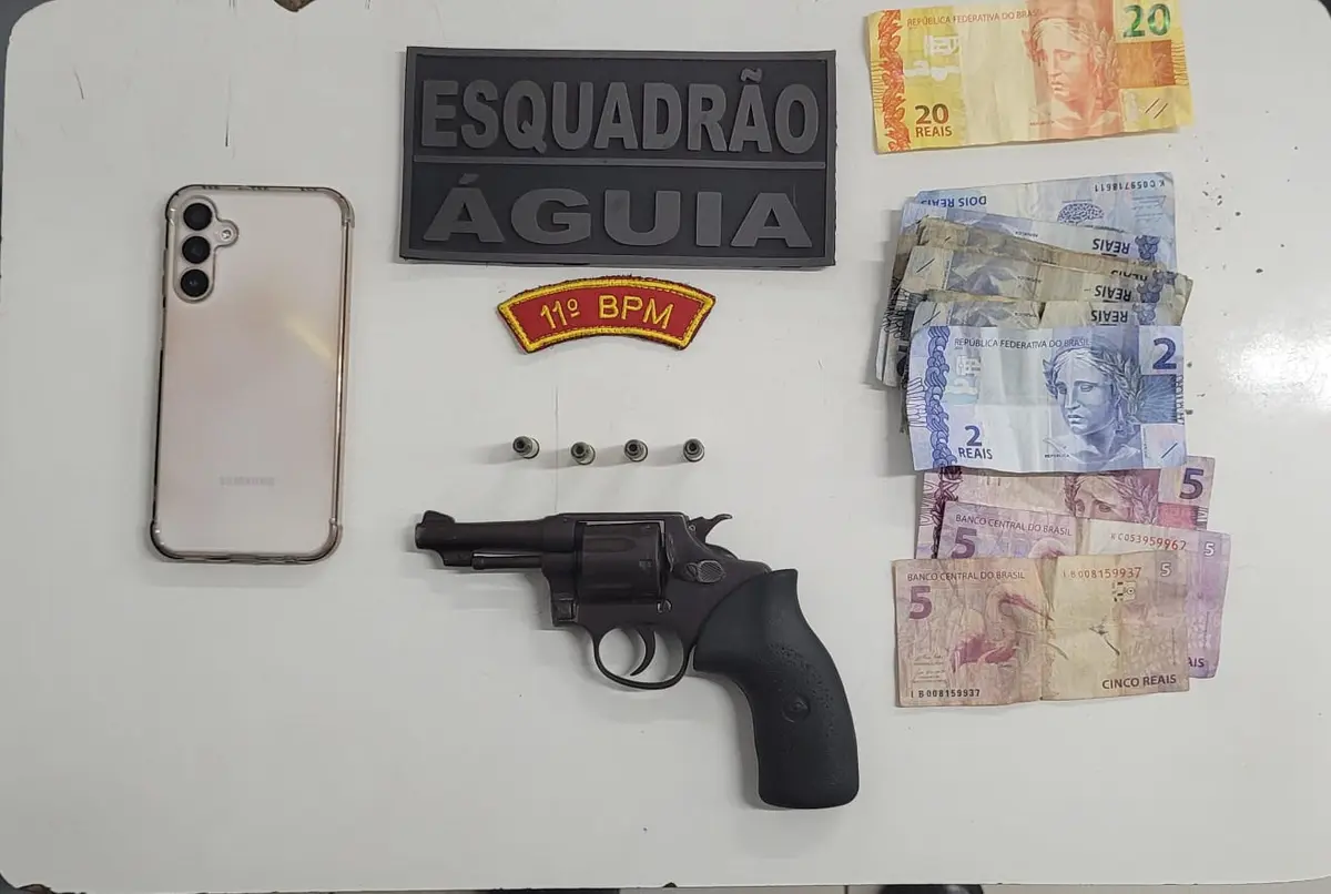 A equipe realizava rondas ostensivas na região, conhecida por ser frequentada por usuários de drogas, quando visualizou três indivíduos em atitude suspeita. Ao perceber a presença dos policiais, um dos homens levou a mão à cintura, o que motivou a abordagem imediata. Durante a revista, a arma foi localizada com o suspeito. Após a prisão, o homem foi conduzido à delegacia, onde foram adotadas as medidas legais cabíveis.