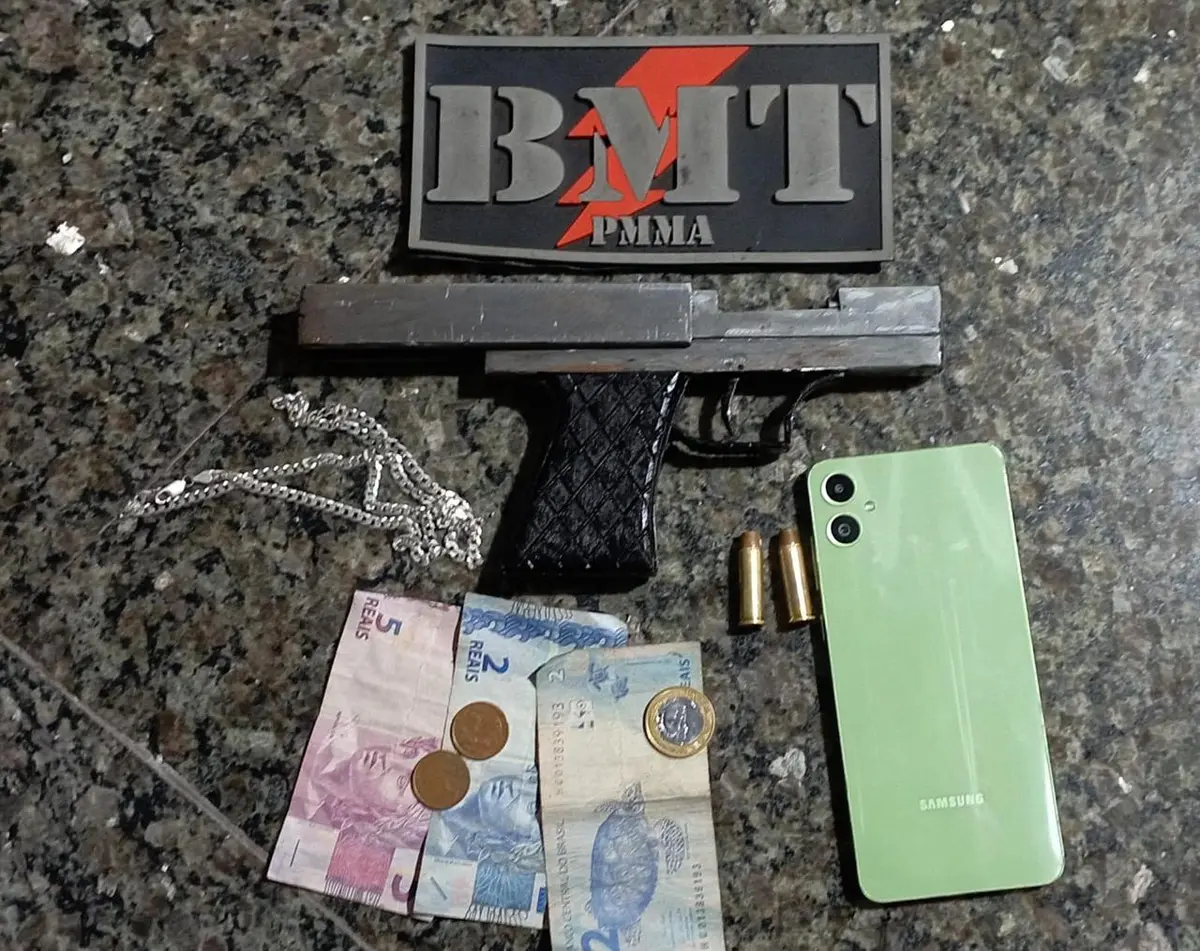Com eles foi apreendido uma arma de fogo de fabricação caseira semi-industrial (calça bala cal. 38), duas munições cal. 38 intactas, R$ 10,10 (dez reais e dez centavos), cordão de cor prata, um celular Samsung verde.