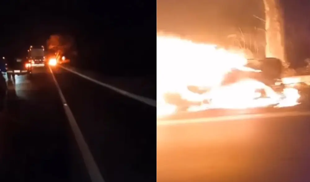 Veículo fica destruído em incêndio após colisão contra animal na BR-316