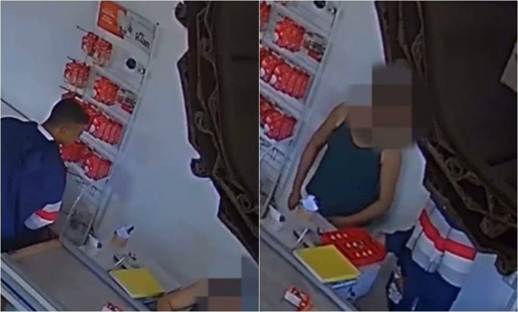 Nas imagens da câmera de segurança do local, é possível ver o momento em que o homem entra no estabelecimento, pega alguns produtos para levar ao caixa e anuncia o assalto.