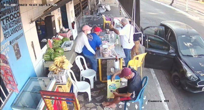 No vídeo é possível observar cerca de quatro homens em um carro preto se aproximando em alta velocidade do estabelecimento, quase atropelando um senhor que estava na rua. Depois disso, três homens armados saem do veículo.