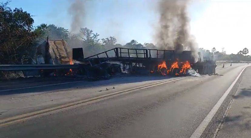 Com o fato, a carreta foi consumida pelas chamas e teve todos os seus compartimentos destruídos. O condutor do veículo não teve ferimentos.