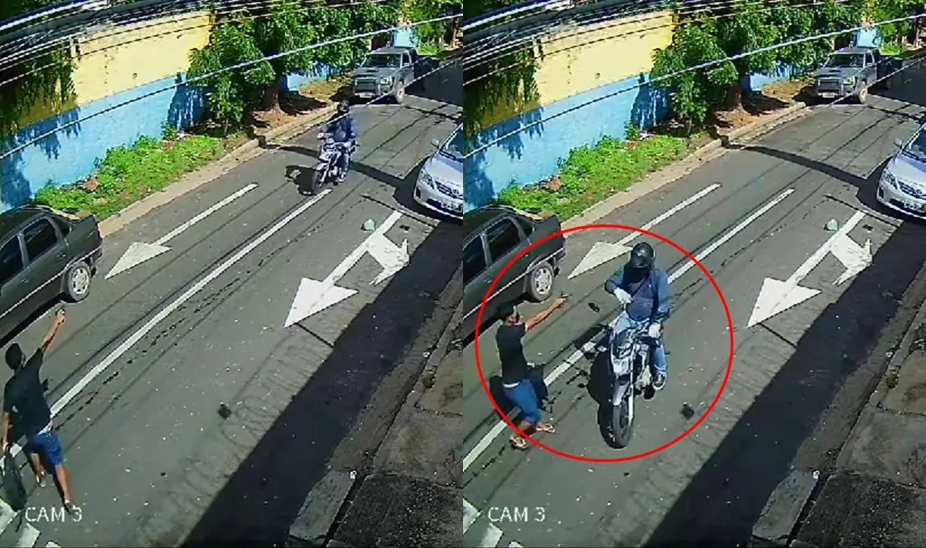 Nas imagens é possível ver que o criminoso anda a pé e puxa um objeto semelhante a uma arma de fogo e, ao avistar o motociclista, anuncia o assalto. A vítima do crime continua seu caminho e chega a colocar a mão no rosto para evitar um possível disparo.