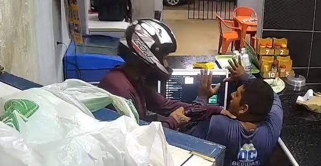 Nas imagens é possível ver o momento em que quatro criminosos invadem o estabelecimento. Um deles pega o celular da vítima e, logo em seguida outro criminoso o aborda pedindo dinheiro e chega a atingi-lo com uma coronhada na cabeça.