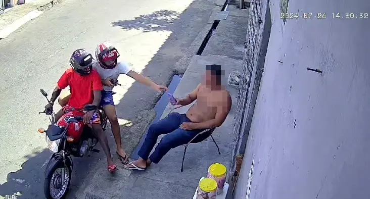 Nas imagens é possível observar a ação da dupla, que chega até a vítima que está sentada na calçada em frente a uma residência. Logo em seguida o garupa aponta a arma, anuncia o assalto e a vítima entrega o celular.