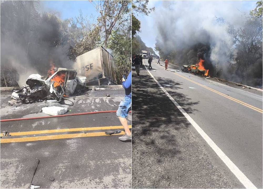 Imagens gravadas por populares mostram a caminhonete em chamas e, logo depois, o impacto do caminhão. Ainda não há informações oficiais sobre feridos.