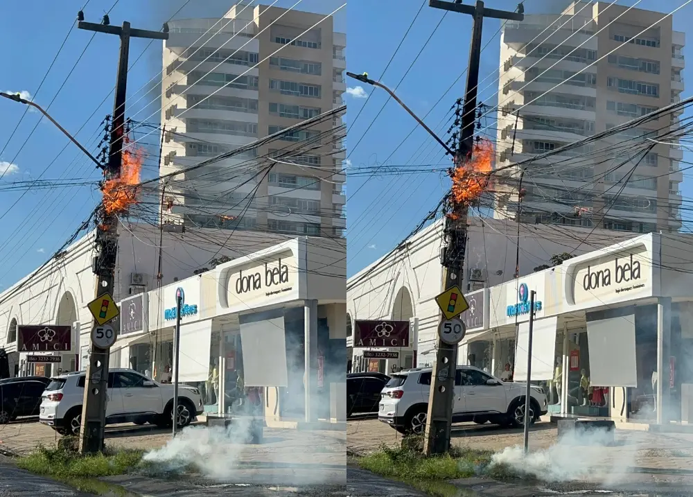 Emaranhado de fios pega fogo em postes da rede elétrica na zona Leste de Teresina