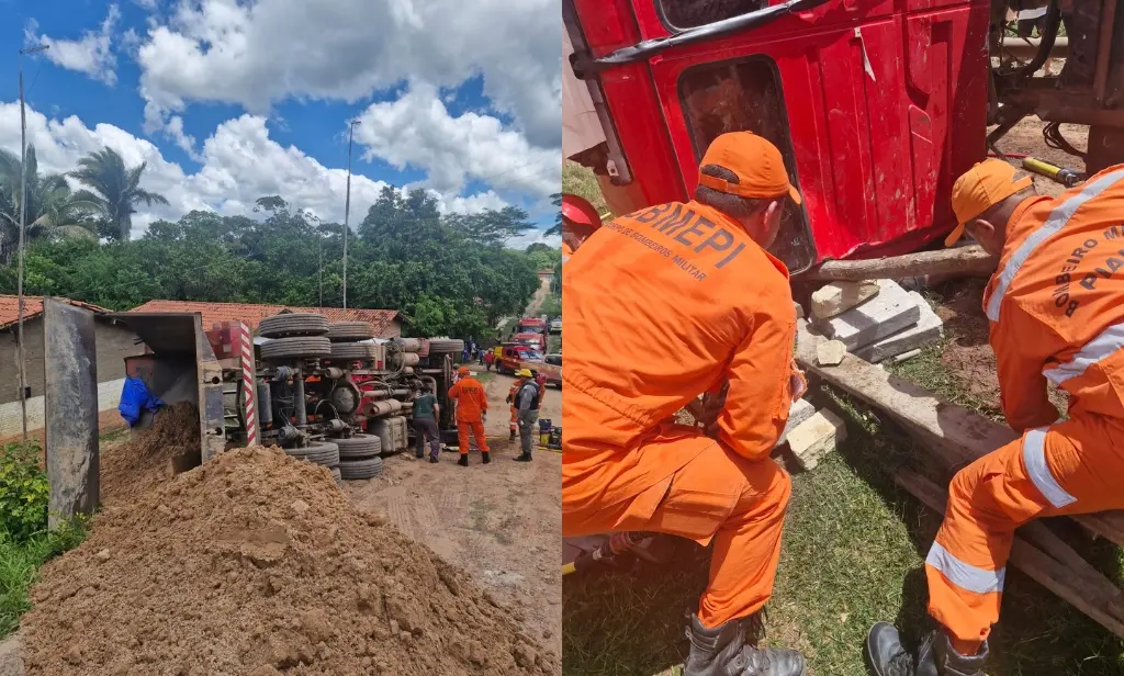 Equipes de resgate constataram que a vítima estava consciente e com vida, mas com lesõesO Corpo de Bombeiros Militar do Piauí foi acionado para resgatar o motorista de uma caçamba que tombou lateralmente enquanto transportava areia, por volta das 11h30 desta quinta-feira (06/02). O acidente ocorreu na região do povoado São Vicente, próximo à PI-112, zona Rural Leste de Teresina.