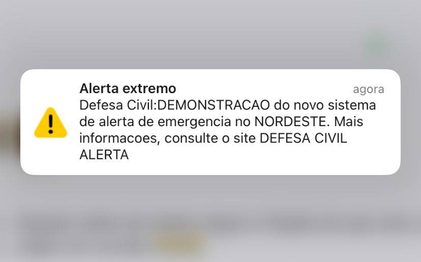 Através de alerta sonoro e de imagem na tela dos smartphones, a Defesa Civil emitiu a seguinte mensagem: "Defesa Civil:DEMONSTRACAO do novo sistema de alerta de emergencia no NORDESTE. Mais informacoes, consulte o site DEFESA CIVIL ALERTA".