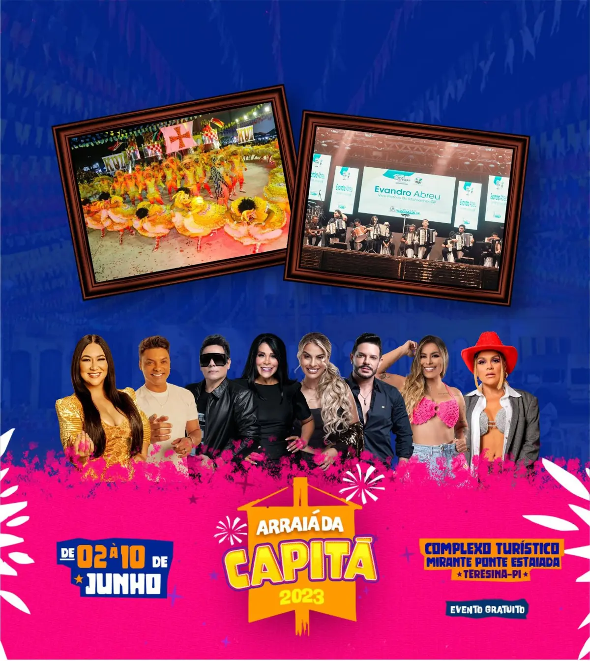 Uma cidade cenográfica será montada com decoração característica de São JoãoO maior evento junino do Piauí está de volta. De dois a dez de junho de 2023, acontece no Complexo Turístico Mirante da Ponte Estaiada, o Arraiá da Capitá, que conta com o apoio da Prefeitura de Teresina, por meio da Secretaria Municipal de Desenvolvimento Econômico e Turismo (SEMDEC).