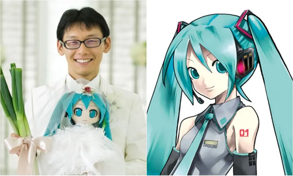 A esposa de Akihiko Kondo, a cantora japonesa Hatsune Miku, é uma personagem fictícia projetada por uma empresa de software que vende pequenas caixas que projetam seu holograma. As caixinhas funcionam como um software que responde a comandos de voz, como as famosas Siri, da Apple, e Alexa, da Amazon. A personagem é uma garota de cabelos azuis que chegam à altura dos joelhos.