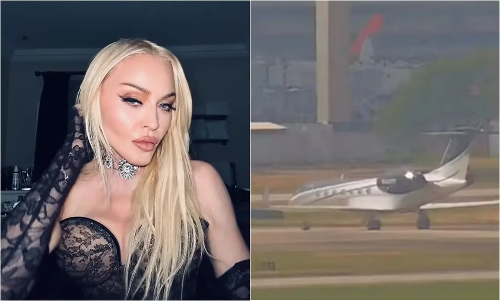 Madonna desceu dentro de um hangar em uma área de apoio que possui acesso para veículos. O voo veio da Cidade do México, local onde aconteceu o último show da turnê 'The Celbretion Tour'.