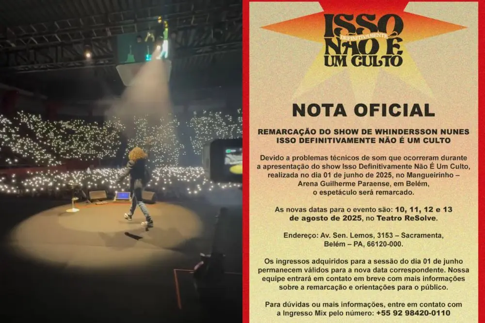 Apresentação será realizada em agosto no Teatro ReSolve; ingressos continuam válidosO humorista piauiense Whindersson Nunes anunciou a remarcação do show "Isso Definitivamente Não É Um Culto" em Belém, no Pará, após enfrentar problemas técnicos de som durante a apresentação do último domingo (01/06). Em nota oficial, ele pediu desculpas ao público e informou que o espetáculo acontecerá em um novo local e datas.