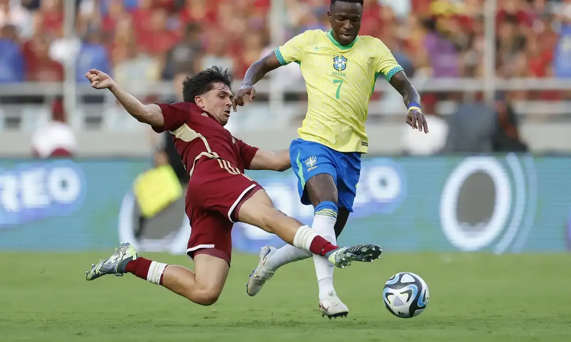 Vinicius Júnior desperdiça cobrança de pênalti no segundo tempoEm uma partida na qual não apresentou um bom futebol, o Brasil não passou de um empate de 1 a 1 com a Venezuela, na noite desta quinta-feira (14/11) no estádio Monumental de Maturín, e assumiu a 3ª posição da classificação das Eliminatórias Sul-Americanas para a Copa do Mundo de 2026 com 15 pontos, a cinco de distância da líder Argentina, que enfrenta o Paraguai a partir das 20h30 (horário de Brasília) no estádio Defensores Del Chaco.