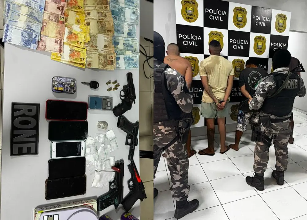 No interior do imóvel, os policiais apreenderam um revólver calibre .38 com munições, uma arma artesanal, uma espingarda modificada para calibre 22, simulacros, além de drogas semelhantes à cocaína e maconha, balanças de precisão, diversos celulares e uma quantia em dinheiro no valor de R$ 2.855,00.