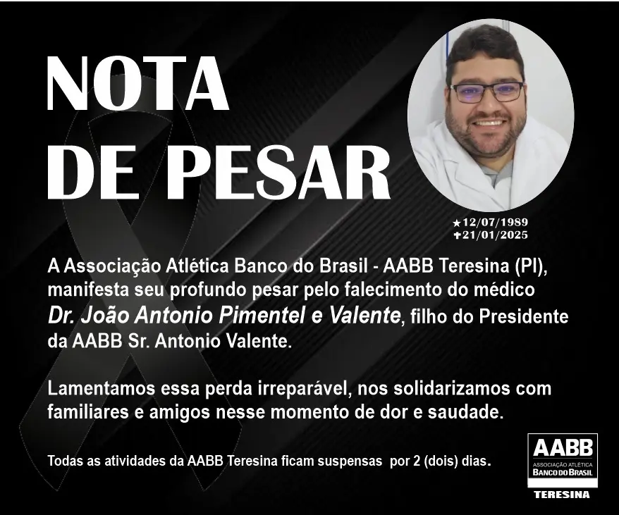 Antônio Pimentel e Valente, é filho do atual presidente da entidade, Sr. Antônio ValenteA Associação Atlética Banco do Brasil (AABB) de Teresina manifesta seu mais profundo pesar pelo falecimento de João Antônio Pimentel e Valente, filho do atual presidente da entidade, Sr. Antônio Valente. João Antônio, médico renomado, faleceu nesta terça-feira (21/01), deixando familiares, amigos e toda a comunidade profundamente consternados com sua partida precoce.
