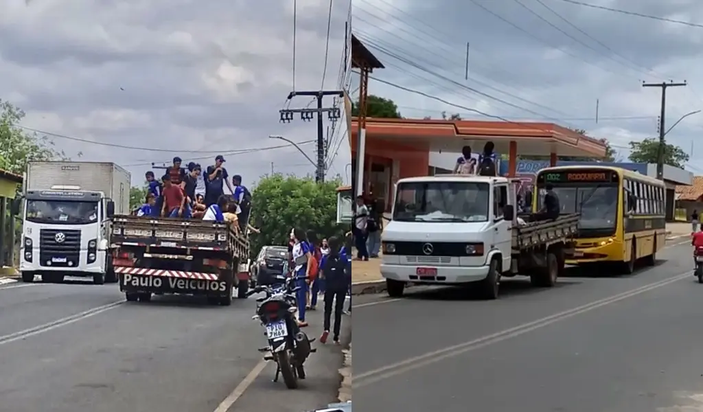 A cena perigosa foi fotografada por populares. Nas imagens é possível ver os estudantes da escola Tertuliano Filho e João Félix, em cima do caminhão que circula pelas ruas da cidade sem nenhuma segurança.