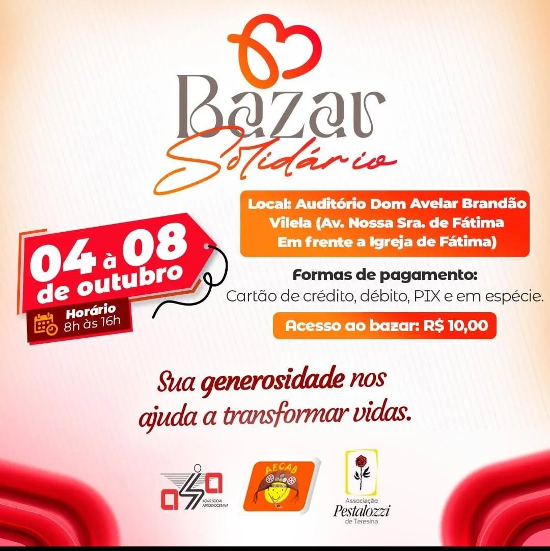 Os valores são considerados abaixo do mercado e os lucros serão revertidos para projetosEntre os dias 04 e 08 de outubro, a Ação Social Arquidiocesana (ASA), juntamente com a Associação Pestalozzi de Teresina e a Associação Educativa e Cultural Asa Branca de Juazeiro do Norte (CE), realizará o Bazar Solidário com a venda de mercadorias doadas pela Receita Federal. A ação vai acontecer das 08h às 16h, no auditório Dom Avelar Brandão Vilela, em frente à Igreja de Fátima, localizada na Av. Nossa Senhora de Fátima, zona Leste de Teresina.