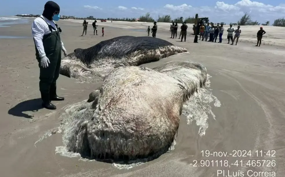 Baleia em estado de decomposição encalha em praia no litoral do Piauí