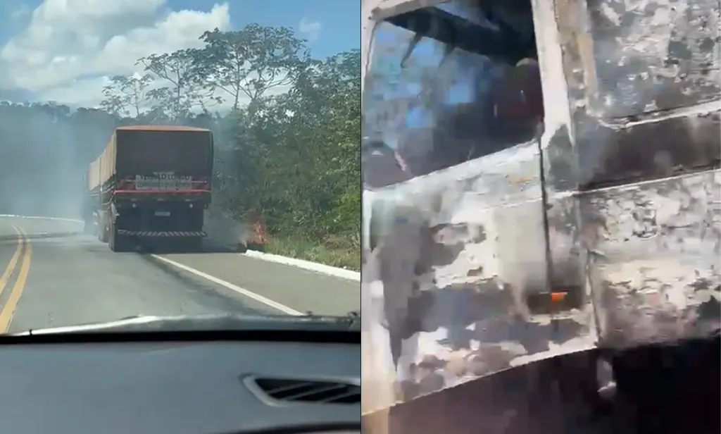 Carreta fica com a cabine destruída após ser atingida por incêndio na BR-343