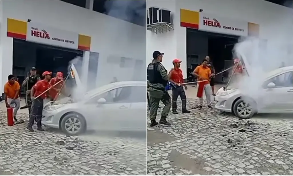 Chamas do veículo foram contidas com ajuda de frentistas e policiais militaresUm carro de modelo Peugeot 207 pegou fogo em um posto de combustível localizado na avenida Presidente Kennedy, zona Leste de Teresina, na manhã desta terça-feira (12/03). As chamas foram contidas após diversas tentativas de frentistas e policiais militares com uso de extintores de incêndio e cabos de vassoura.