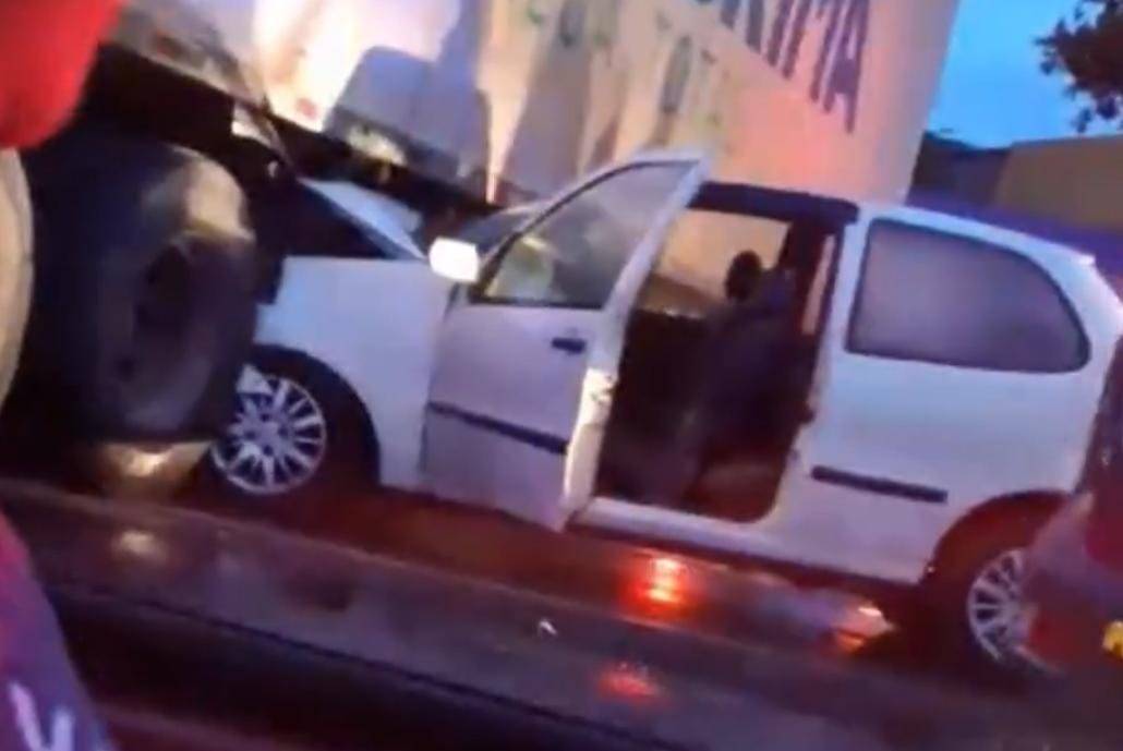 Após o trabalho de sinalização, o condutor de um carro acabou colidindo contra o caminhão. Imagens de pessoas que trafegavam pelo local mostram o veículo preso no automóvel de carga devido a força do impacto.