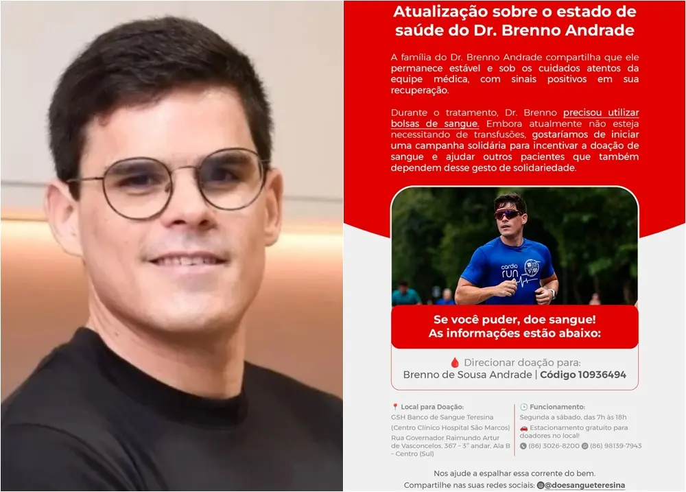 A mobilização busca ampliar os estoques dos bancos de sangue da capitalA família do médico cardiologista Brenno de Sousa Andrade, que está internado no Hospital São Marcos em Teresina, divulgou nesta terça-feira (23) uma atualização sobre seu estado de saúde. Segundo o comunicado, Dr. Brenno permanece estável e sob cuidados intensivos da equipe médica, apresentando sinais positivos de recuperação.