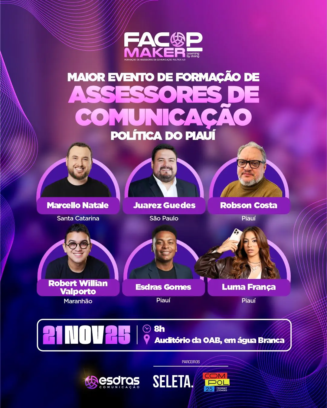 Entre os nomes confirmados estão grandes referências da área em todo o paísO maior evento de formação de assessores de comunicação política do Piauí já tem data marcada: 21 de novembro de 2025, a partir das 8h, no Auditório da OAB, em Água Branca. O FACOP MAKER 2025 chega com uma proposta ousada e inovadora — unir teoria e prática em uma imersão completa sob o lema “Learning by doing” (aprender fazendo).