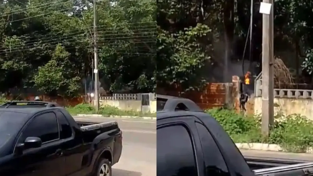 Nas imagens, é possível observar a corrente elétrica e as chamas atingindo o poste na avenida razoavelmente movimentada, com um carro chegando a parar ao lado.