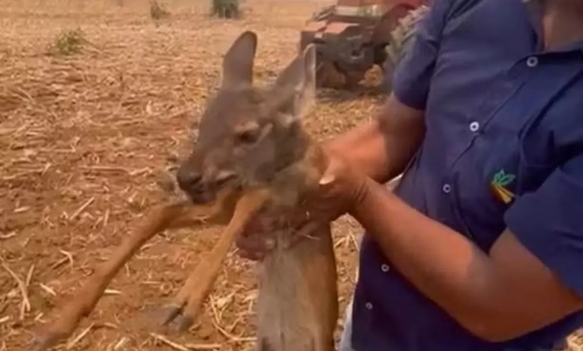 Filhote de veado é resgatado de incêndio em fazenda em Baixa Grande do Ribeiro
