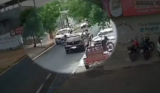 Um vídeo de segurança revela o instante em que um homem usa sua moto para bloquear o caminho do carro da vítima. Em seguida, ele invade o veículo e, logo depois, sai com a vítima como refém.