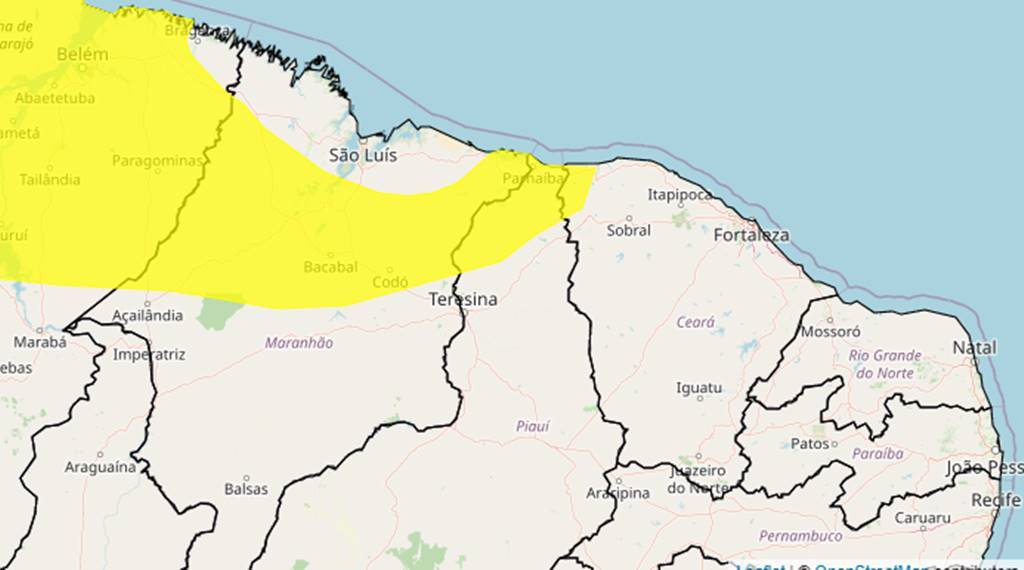 O alerta perdurará até esta quinta-feira (25/05) quando emitirão um novo boletimNessa quarta-feira (24/05), o Instituto Nacional de Meteorologia (Inmet) emitiu um alerta amarelo de chuvas intensas para o Norte do Piauí. Conforme o alerta, deve haver chuva entre 20 e 30 mm/h ou até 50 mm/dia, além de ventos intensos (40-60 km/h). De acordo com a previsão, há pouco risco de corte de energia elétrica, queda de galhos de árvores, alagamentos e de descargas elétricas. O alerta perdurará até esta quinta-feira (25/05) quando emitirão um novo boletim.