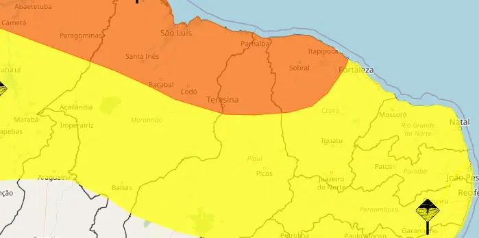 O alerta amarelo atinge as regiões Sudeste Piauiense, Centro-Norte Piauiense e Sudoeste Piauiense.