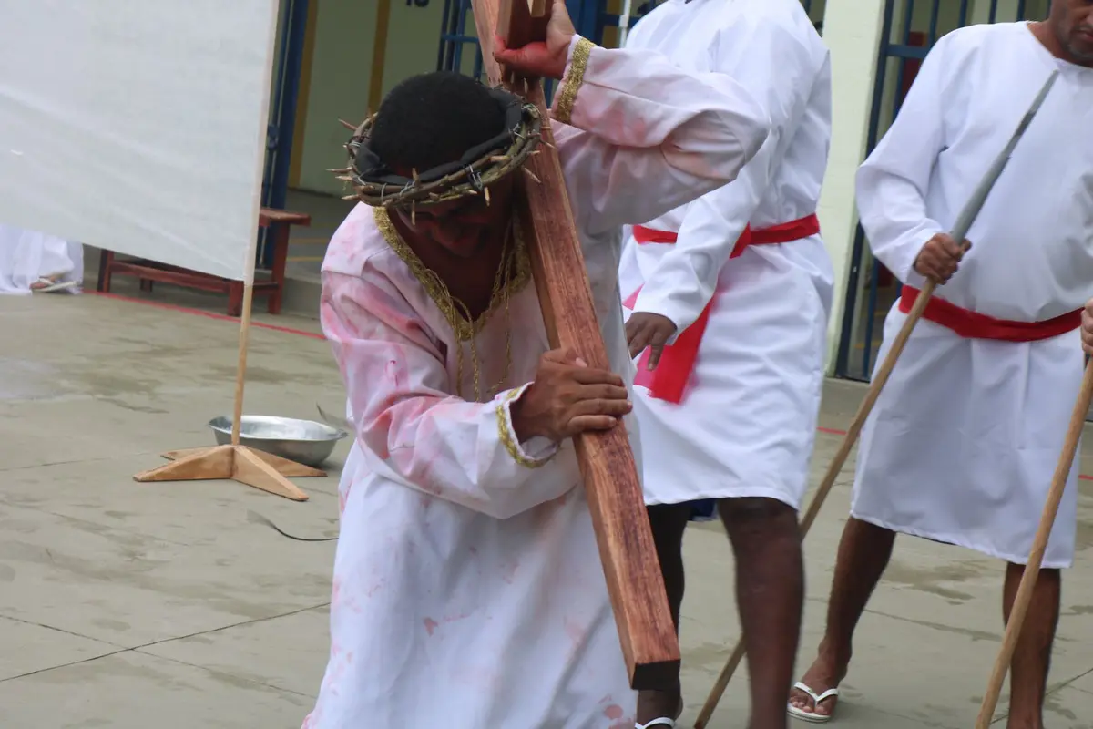 Internos da Penitenciária Irmão Guido encenam peça de teatro 'Paixão de Cristo'