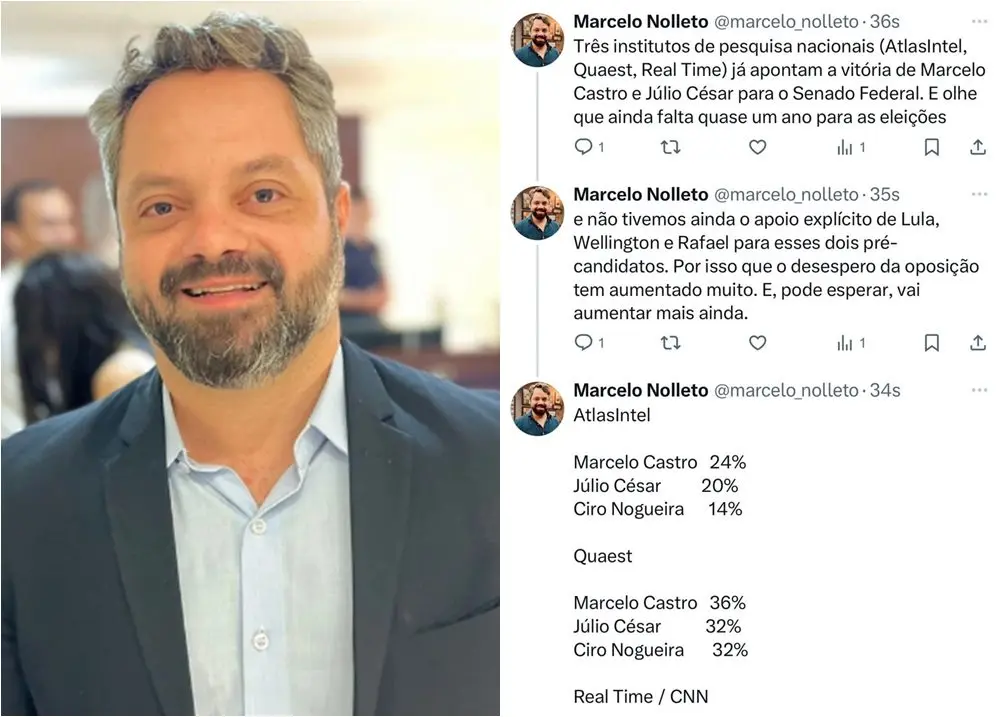 Segundo Nolleto, os levantamentos indicam vantagem expressiva dos pré-candidatos Marcelo Castro e Júlio César, nomes alinhados à base do governador Rafael Fonteles e do presidente Luiz Inácio Lula da Silva. “Três institutos de pesquisa nacionais já apontam a vitória de Marcelo Castro e Júlio César para o Senado Federal. E olhe que ainda falta quase um ano para as eleições”, publicou o secretário.