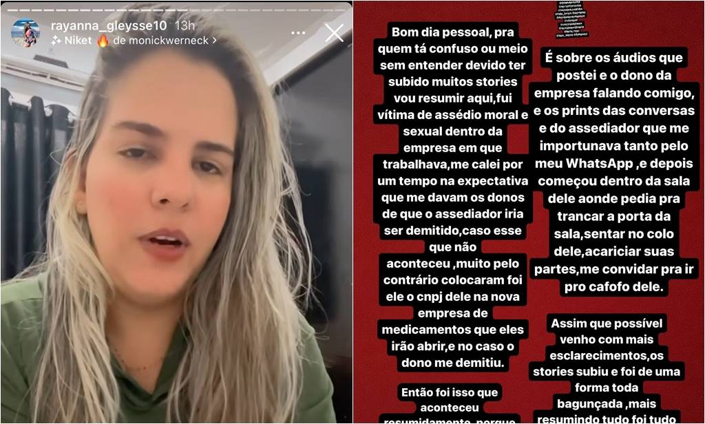 Assediador chegou a pedir que funcionária o acariciasse em suas partes íntimas na empresaUm mulher identificada como Rayanna Gleysse utilizou suas redes sociais para denunciar um caso de assédio sexual e moral que vinha sofrendo dentro de uma empresa em Timon (MA). Após ter relatado o caso a seus superiores, Rayanna foi demitida. A mulher não revelou de qual empresa se trata e nem identificou o assediador nas publicações feitas nesta quarta-feira (24/01).