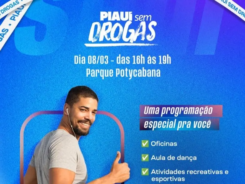 Com programação diversificada, evento é gratuito e começa às 16hO projeto “Piauí Sem Drogas” convida a população para um evento gratuito e aberto ao público no dia 8 de março, das 16h às 19h, no Parque Potycabana, em Teresina. O evento tem como objetivo principal sensibilizar sobre os perigos do uso de drogas e promover um estilo de vida saudável.