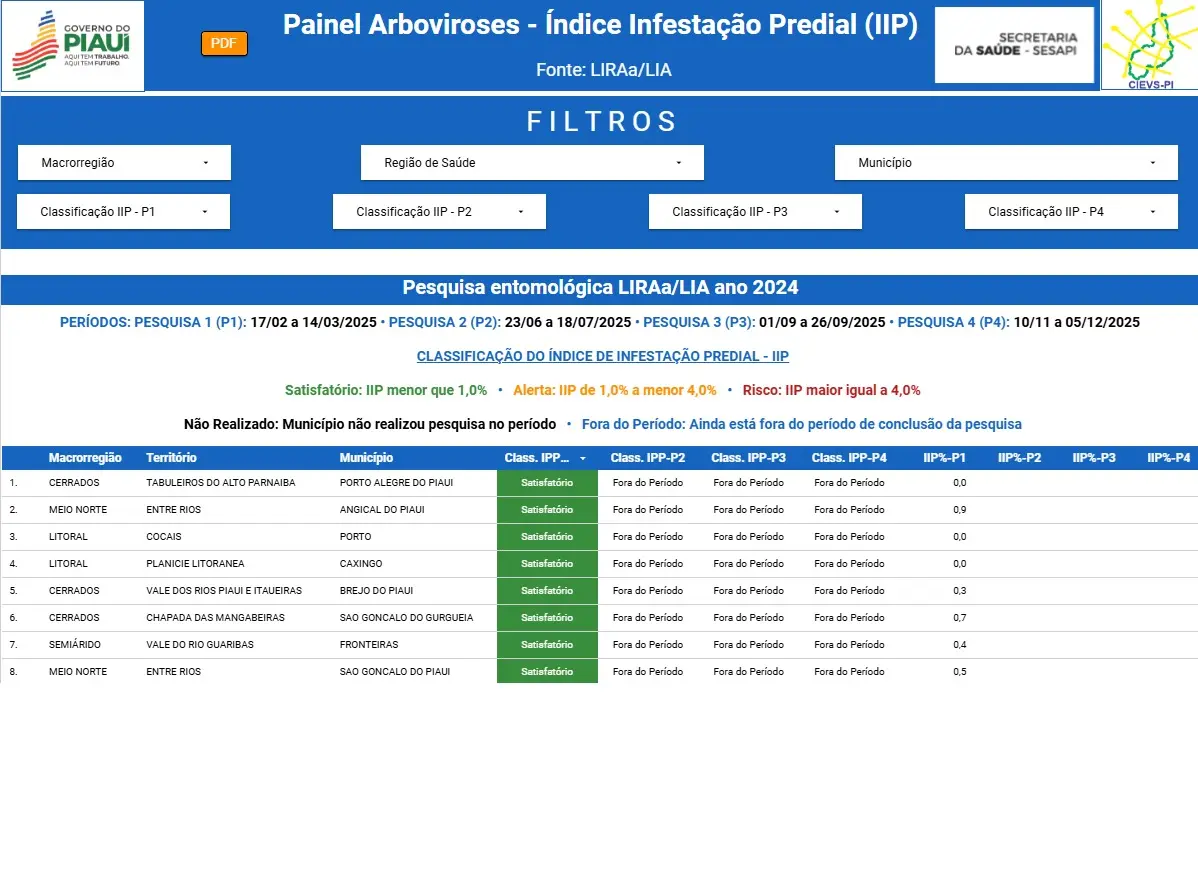 Segundo dados enviados pelos 224 municípios piauienses, 116 atingiram situação satisfatória (51,79%) em relação à presença larvária do mosquito Aedes. Outros 94 municípios registraram situação de alerta (41,96%), enquanto 14 ficaram em situação de risco (6,25%).