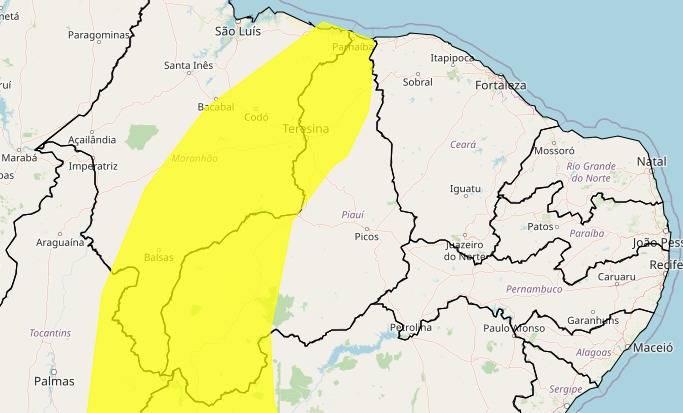 As chuvas devem atingir municípios como Parnaíba, Teresina, Floriano e Bom JesusO Instituto Nacional de Meteorologia (Inmet) publicou um aviso nesta sexta-feira (22/03) de perigo potencial de chuva intensa entre 20 e 30 mm/h ou até 50 mm/dia com ventos intensos (40-60 km/h) nas regiões Norte e Sul do Piauí. Segundo o alerta amarelo, há baixo risco de corte de energia elétrica, queda de galhos de árvores, alagamentos e de descargas elétricas. Um novo boletim deve ser publicado às dez horas deste sábado (23).
