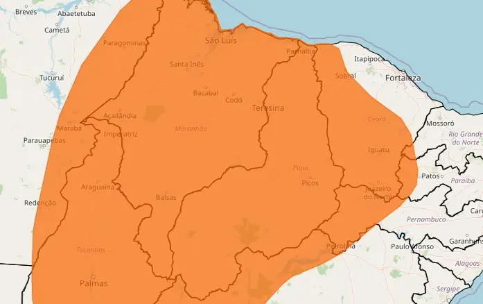 A mínima durante todo o dia em Teresina será de 23°C e a máxima de 31°CO Instituto Nacional de Meteorologia (Inmet) emitiu um alerta laranja de perigo devido às chuvas intensas que podem cair no estado neste sábado (24/02). O alerta iniciou nesta sexta-feira (23) e é válido até as 10 horas deste sábado (24), quando deve ser divulgado outro boletim. O alerta é válido para todo o Piauí.
