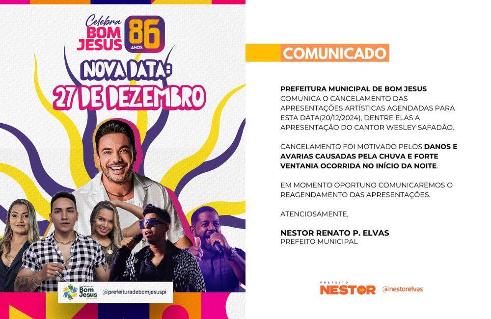 Evento adiado por temporal que derrubou o palco, será parte das comemorações pelos 86 anos da cidadeApós o cancelamento do show de Wesley Safadão e da banda Moleca 100 Vergonha na noite desta sexta-feira (20/12), devido a um temporal que causou a queda do palco em Bom Jesus, a prefeitura da cidade anunciou uma nova data para a apresentação. O evento foi reagendado para o dia 27 de dezembro e seguirá como parte das celebrações dos 86 anos do município.