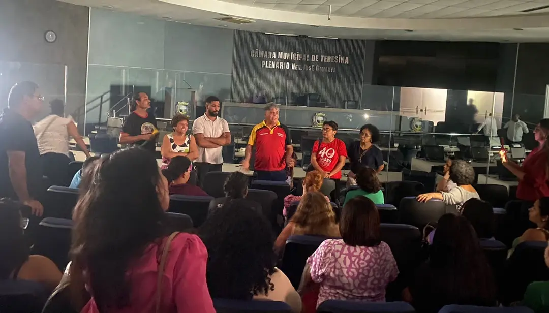 Professores se mantiveram na plenária após votação; local teve luz cortada e policiamento acionadoOs profissionais municipais da educação aprovaram a continuidade da greve dos professores após vereadores da Câmara Municipal de Teresina aprovarem o veto de Dr. Pessoa no aumento de 20,8% salário da classe nesta quinta-feira (04/04). Após o fim da sessão, os professores permanecem na plenária, que foi fechado e teve a energia elétrica cortada. As entradas e saídas foram bloqueadas por policiais.