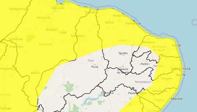 O alerta atinge o Centro-Norte Piauiense, Sudoeste Piauiense e o Norte Piauiense.