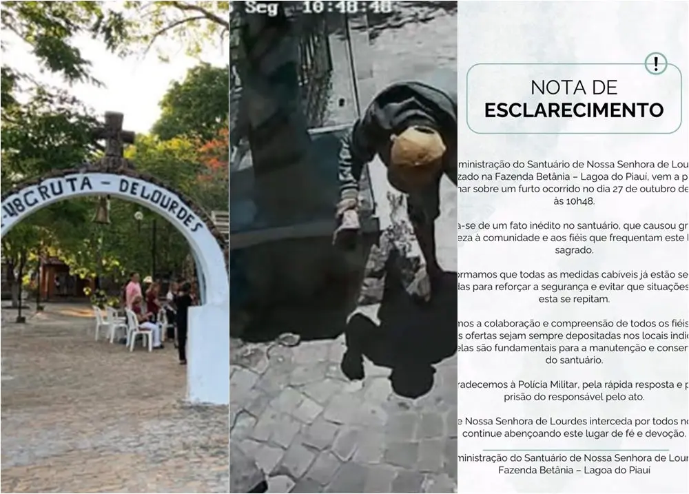 Na nota, a administração agradeceu à Polícia Militar pela rápida resposta e pela prisão do suspeitoA administração do Santuário de Nossa Senhora de Lourdes, localizado na Fazenda Betânia, em Lagoa do Piauí, divulgou uma nota de esclarecimento após o registro de um furto no local, ocorrido na manhã do último domingo (27), por volta das 10h48.