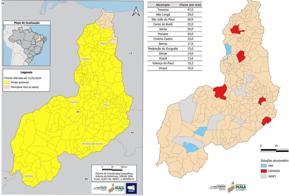 O alerta é válido até as 10h da manhã do dia 12 (sexta) para 210 municípios de todas as regiões do Piauí. O boletim, emitido pelo Instituto de Meteorologia (INMET), relata risco de chuvas de até 20 e 30 mm/h ou até 50 mm/dia e ventos de 40 a 60 km/h.