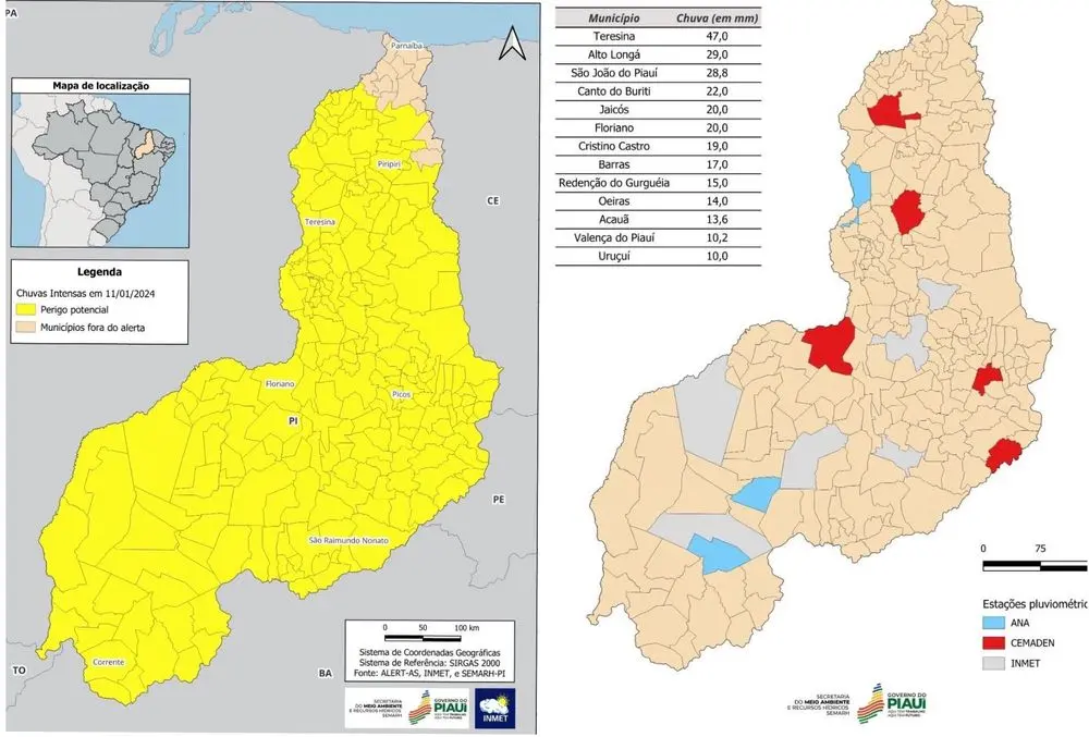 Modelos meteorológicos apontam para período chuvoso até o final de janeiro em todo o estadoA Secretaria de Meio Ambiente e Recursos Hídricos do Estado do Piauí (Semarh) emitiu, nesta quinta-feira (11/01), um alerta amarelo para perigo potencial de chuvas intensas com fortes ventos em 210 municípios do Piauí. O alerta estará ativo até esta sexta-feira (12/01).