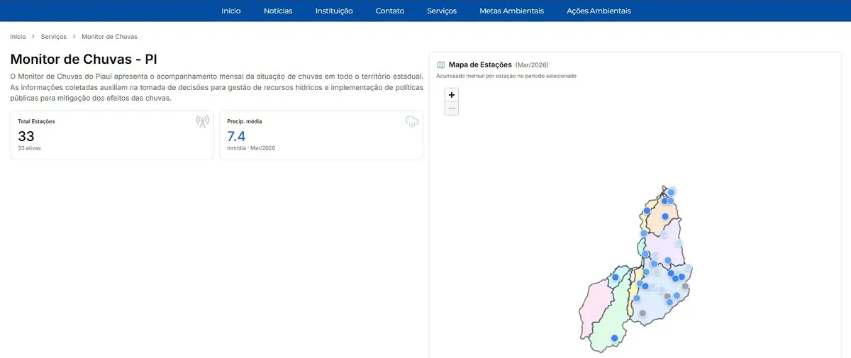 Uma das novidades é o painel de chuvas, que apresenta informações em tempo real sobre o volume acumulado em 33 pontos distribuídos pelo território piauiense. Já a área dedicada à qualidade da água reúne dados coletados em 70 locais monitorados pela secretaria.