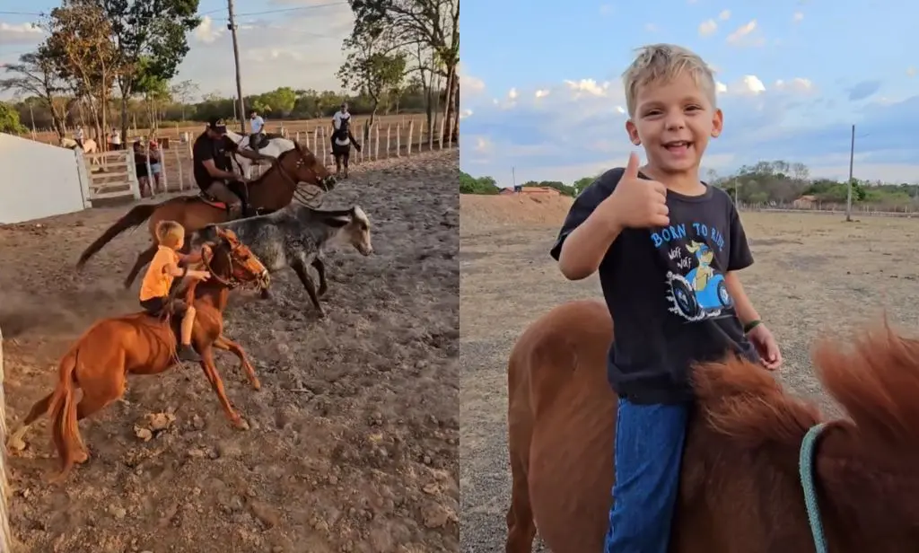 Pega de boi no mato é uma prática um pouco arriscada, mas para o “vaqueiro mirim” se trata apenas de um pequeno obstáculo. Seus pais, por sua vez, dizem que o garotinho sempre teve essa paixão pelo campo e pelos animais.